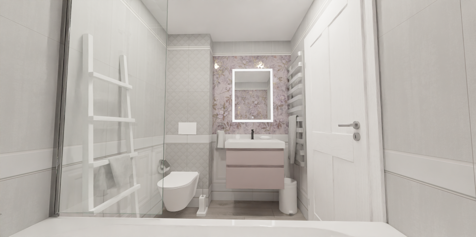 Нежная матовая серия с цветами магнолии дарит интерьеру гармонию и красоту. Белая плитка смотрится оригинально и интересно благодаря структуре классической панели буазери и структуре каретной стяжки. Акцентная стена у ванной украшена необыкновенным нежно-сиреневым панно, создающим эффект керамических обоев.
