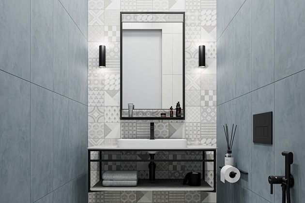 Основу интерьера составляет керамическая серия Онда. Главная роль отведена акцентной стене, на которой расположена керамическая плитка с узорами в стиле пэчворк. Они добавляют интерьеру уникальности и индивидуальности. Разнообразие узоров и цветов создает игру света и тени, делая комнату живой и динамичной. Остальные стены выполнены в спокойных светло-синих и светло-серых тонах, наполняющих помещение ощущением свежести и простора.