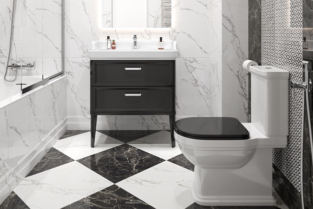 Пол ванной комнаты выложен керамогранитом Коррер черного и белого цветов в шахматном порядке. Это добавляет интерьеру динамики и энергии. Керамогранит — это прочный и долговечный материал, который не боится влаги и механических повреждений.