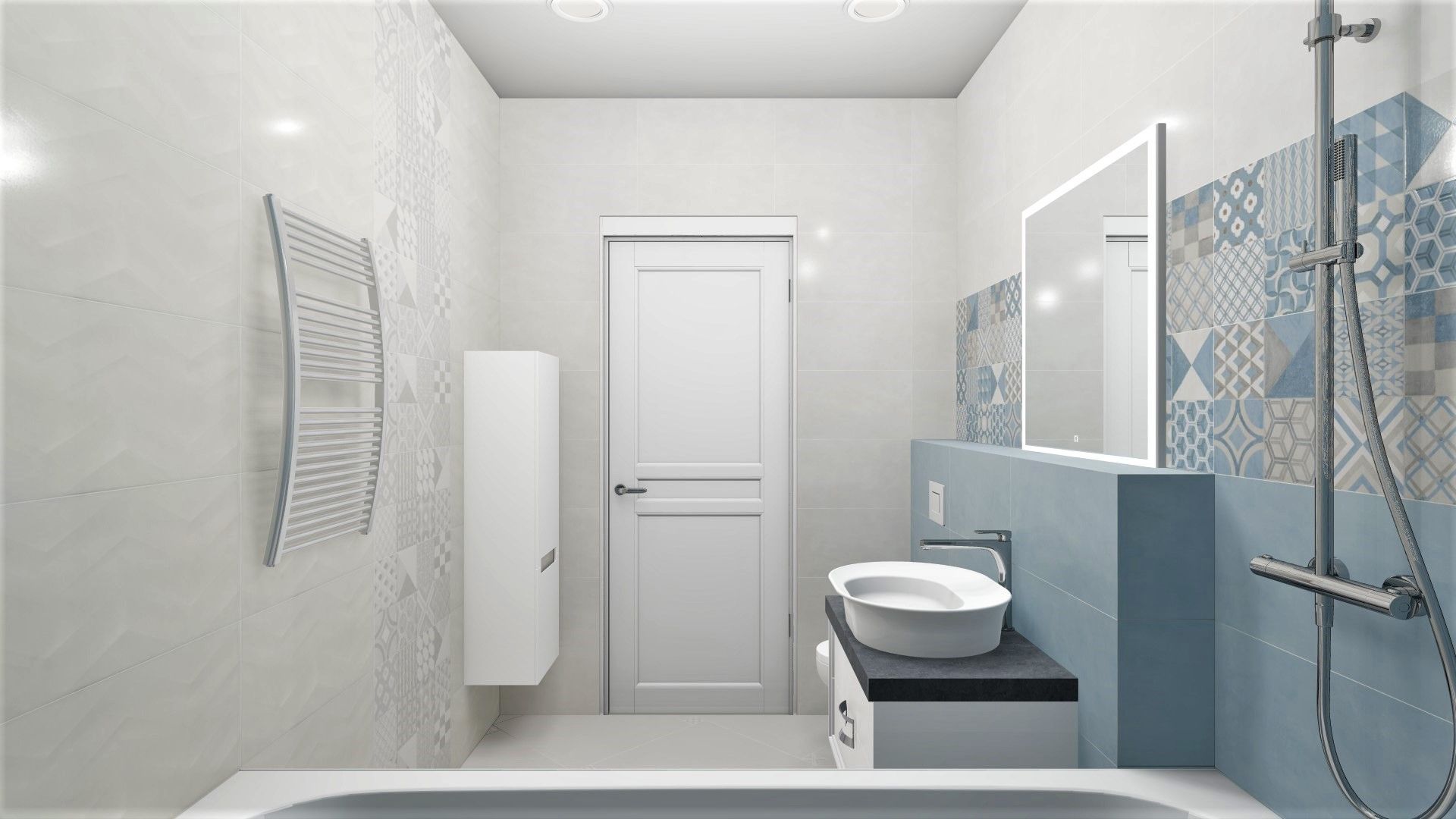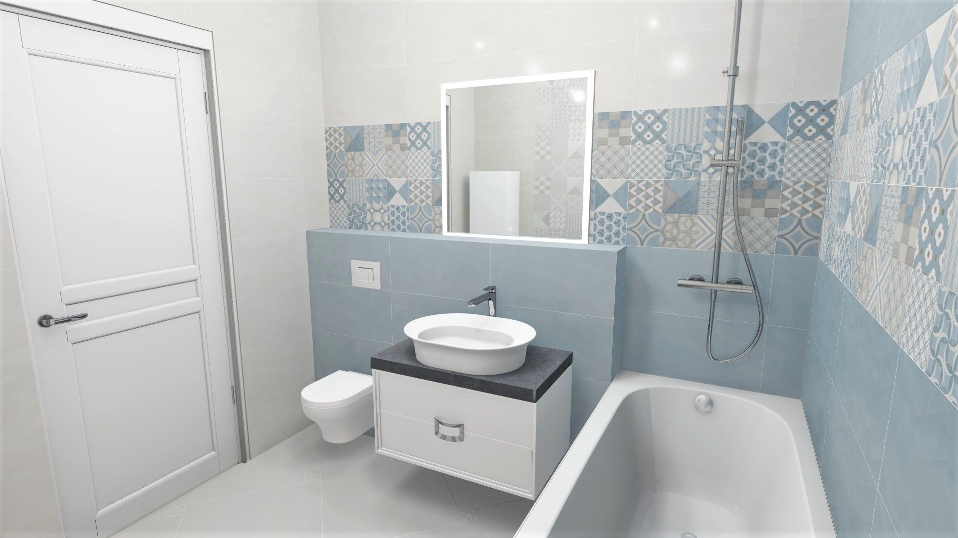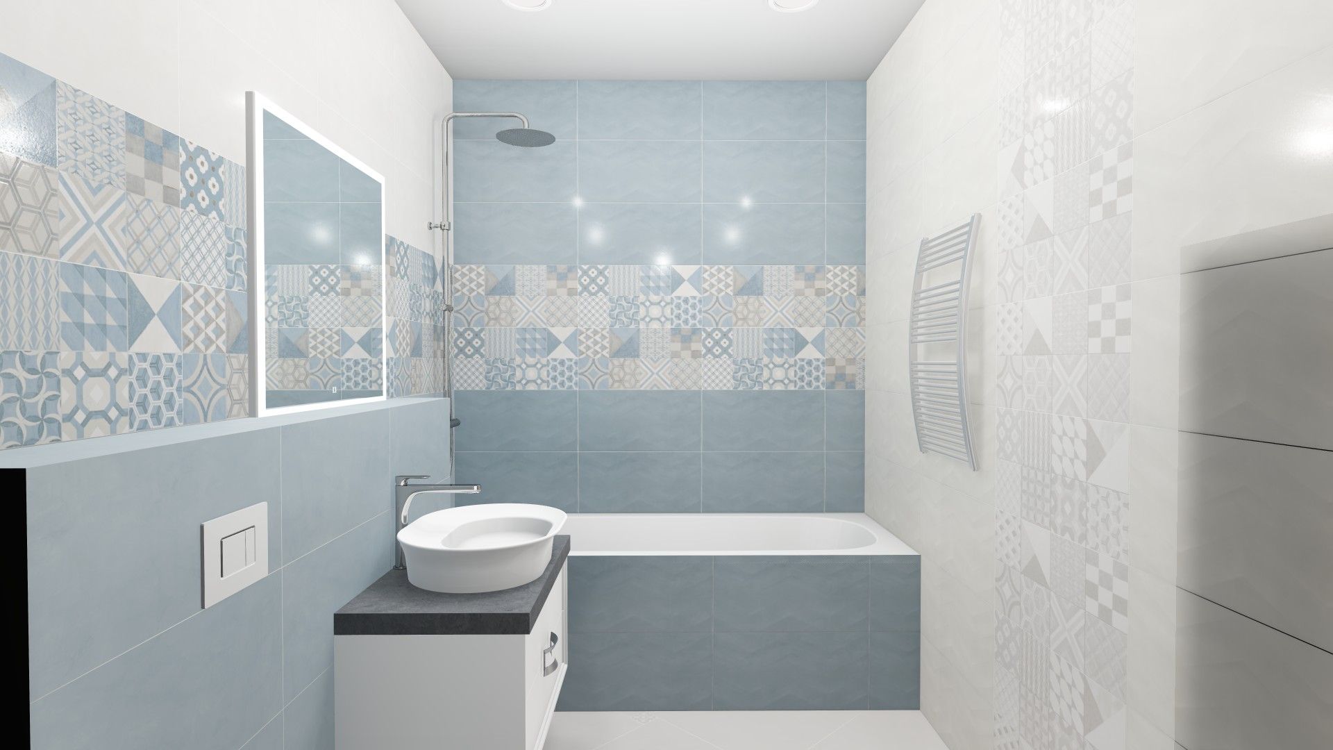 Это современный интерьер ванной комнаты в светлых тонах. Интерьер стильный, но при этом дает ощущение домашнего уюта. Декоры Онда в стиле пэчворк напоминают теплое лоскутное одеяло и создают уютную атмосферу.