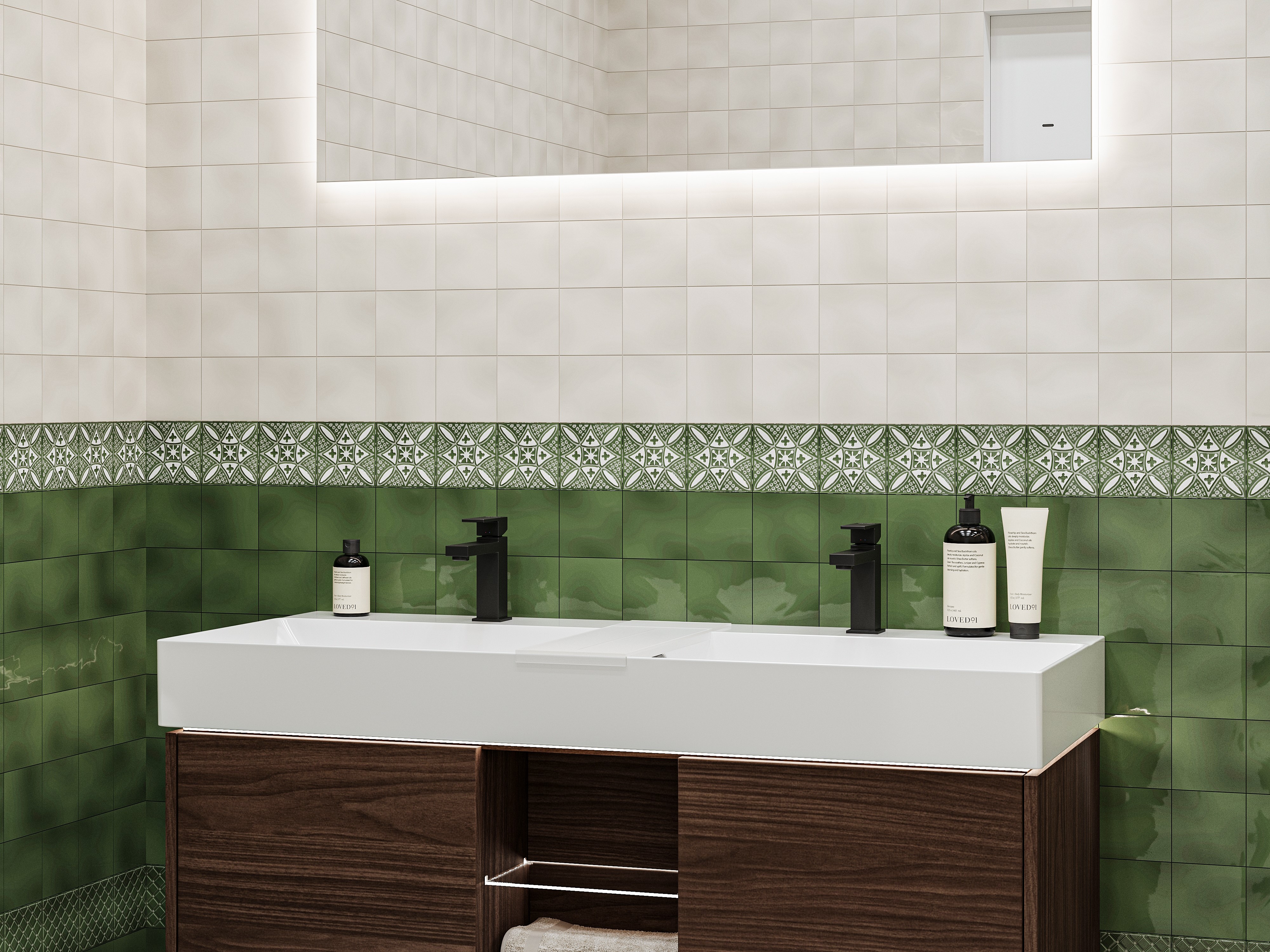 Стены облицованы керамической мозаикой Бахия в зелёных и светло‑серых тонах. Небольшие фрагменты создают эффект ручной работы, отсылающий к традициям майолики. Плавные переходы между оттенками формируют целостный, гармоничный фон, который одновременно служит выразительным акцентом и базой для остальной обстановки.