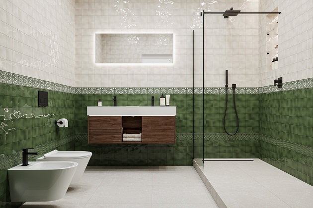В результате складывается пространство, где традиционная эстетика майолики органично сочетается с современными материалами и технологиями. Серо‑зелёные тона создают умиротворяющую атмосферу, а лаконичная сантехника и контрастные смесители добавляют интерьеру динамики и актуальности. Функциональность решений делает санузел не только красивым, но и удобным для повседневного использования.
