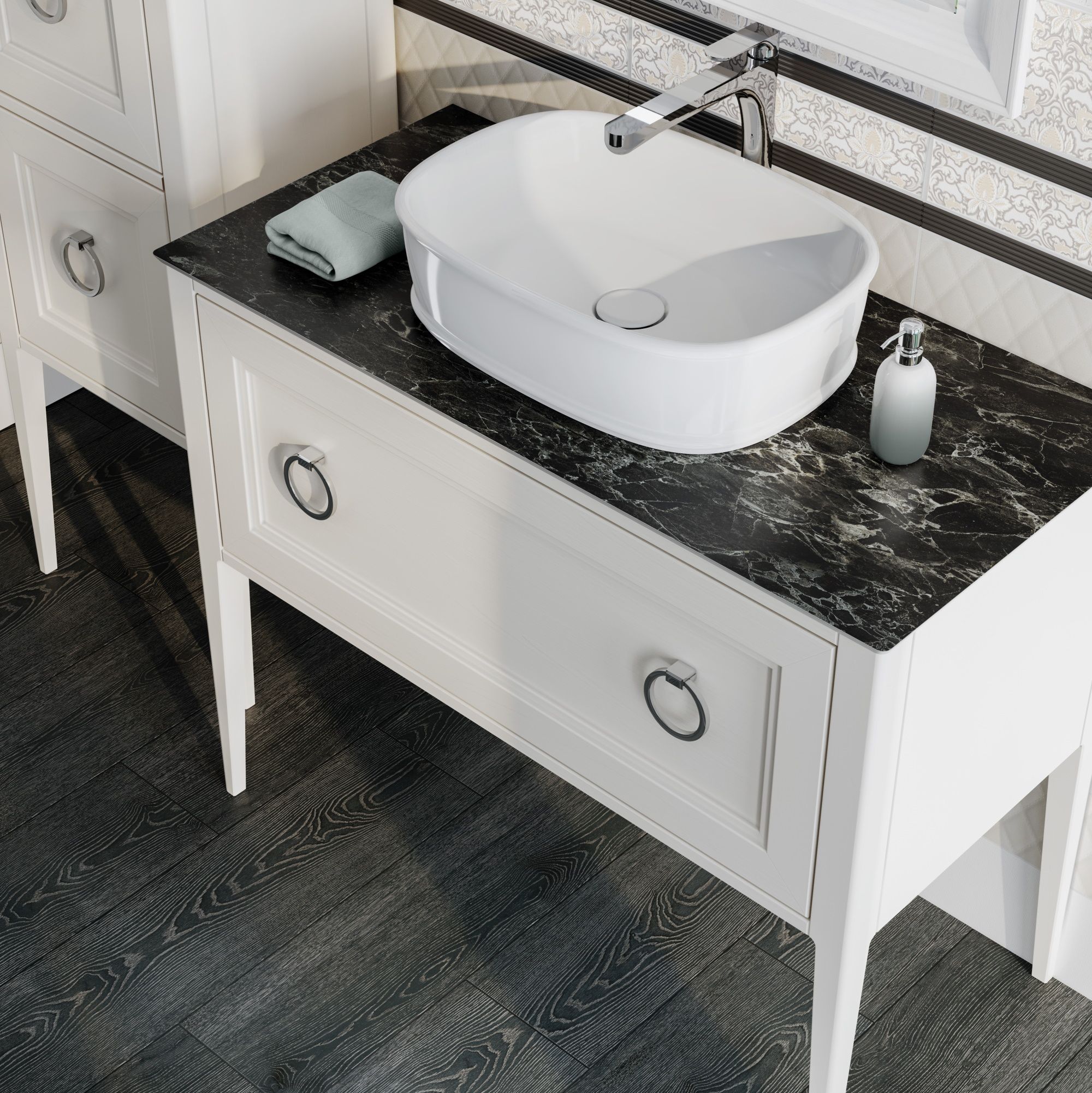 Круглая раковина Чирко диаметром 36 см отлично сочетается с традиционным дизайном тумб серии Плаза Классик, для более смелых и оригинальных решений рекомендуем выбрать тумбу из серии Плаза Модерн. Для овальных раковин Чирко подходят классические тумбы Плаза Классик.