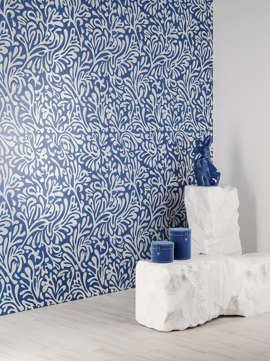 На декоративном элементе «Декупаж» использована графика в узнаваемом стиле Матисса, в бело-голубой гамме. Специальный перламутровый состав создаёт на поверхности эффект отдельных сверкающих кристаллов. Универсальные декоры формата 60×119,5 могут служить визуальными акцентами в разных помещениях, в керамической раскладке различной стилистики.