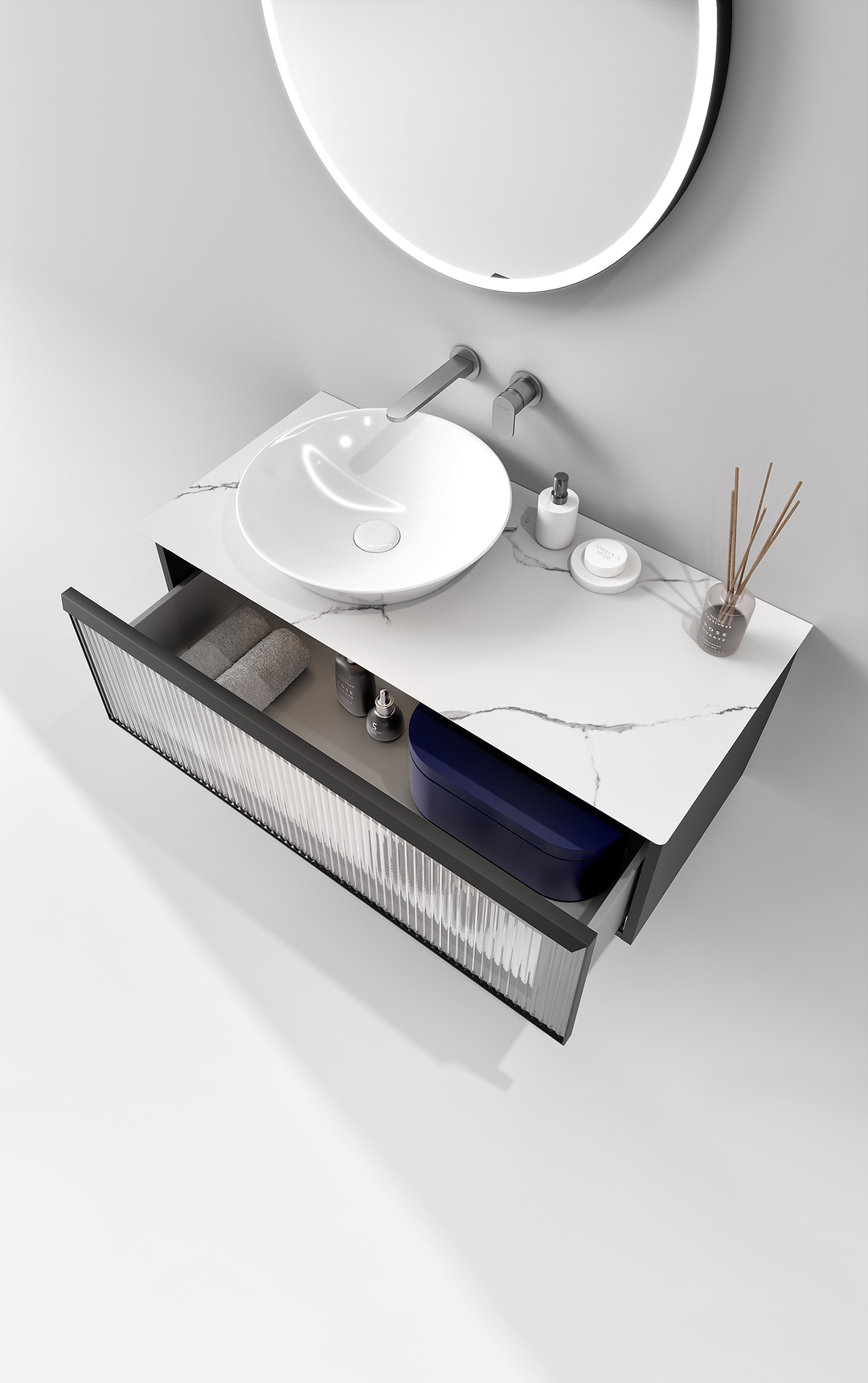 Тумба «Иконико» — стильное и практичное решение, которое можно сочетать с большинством накладных раковин из ассортимента KERAMA MARAZZI. Кроме того, Иконико идеально подчёркивает и выделяет Коно: флагманскую раковину совершенной конусовидной формы с полусферической чашей. Тумба разработана совместно с Berloni Bagno — известным итальянским производителем мебели для ванных комнат.