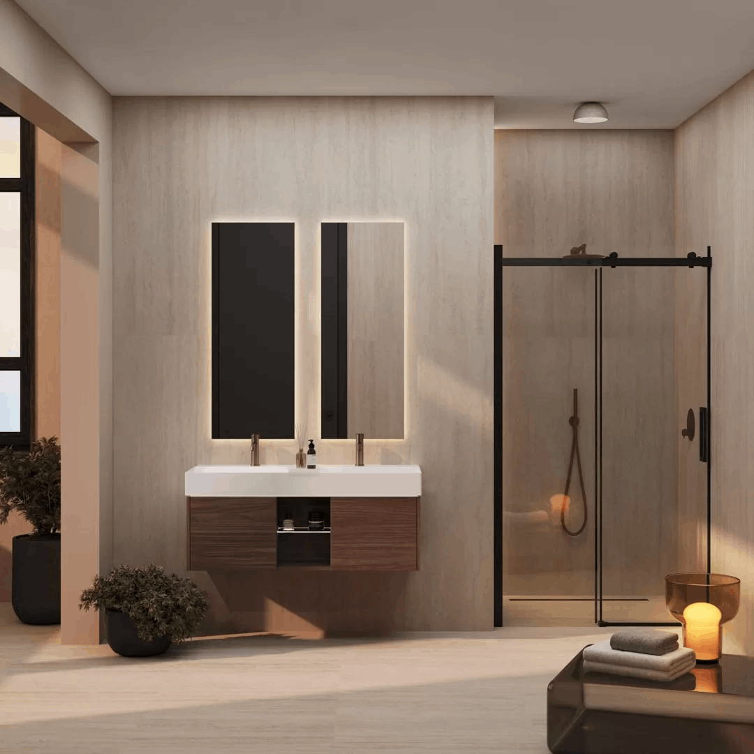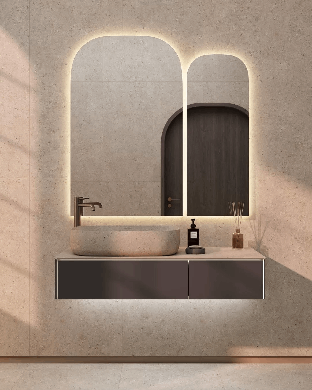 Зеркала «Ветрата» заявляют в ванной новую форму, в которой можно узнать стройную венецианскую арку или оконный проём. Расположенные рядом, такие зеркала напоминают о фасадах, выстроившихся в ряд вдоль венецианских каналов. Интерьерная подсветка помогает менять настроение обстановки от утреннего к вечернему.